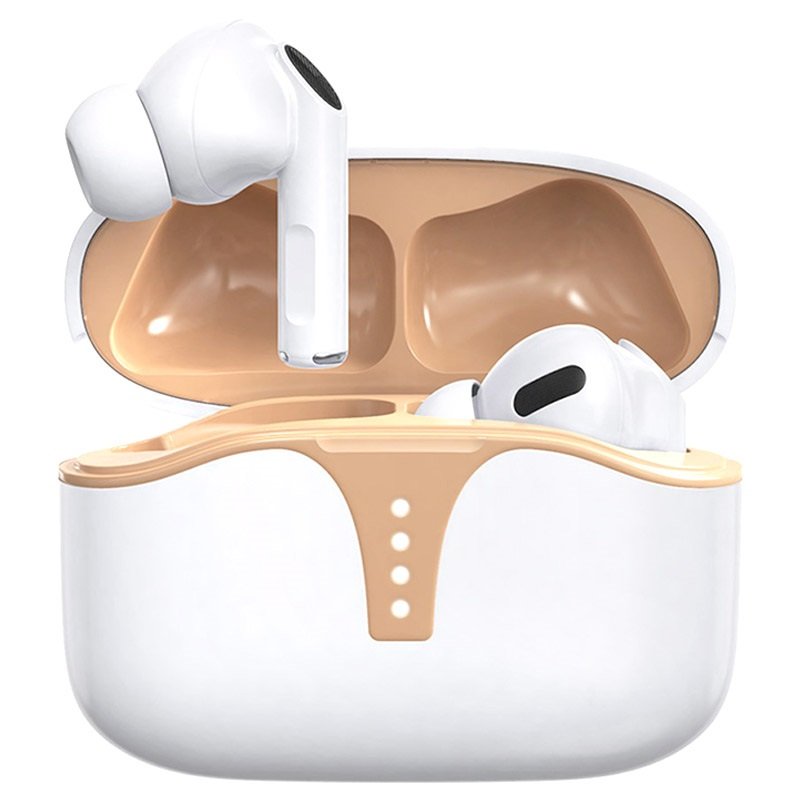 Disse M20 TWS høretelefoner er endnu et fedt par budgetvenlige, trådløse earbuds til dig. Disse earbuds er hvide, men opladerkassen har også en ørken-rosa farve. Det er uden tvivl et sødt og stilfuldt stykke tilbehør.