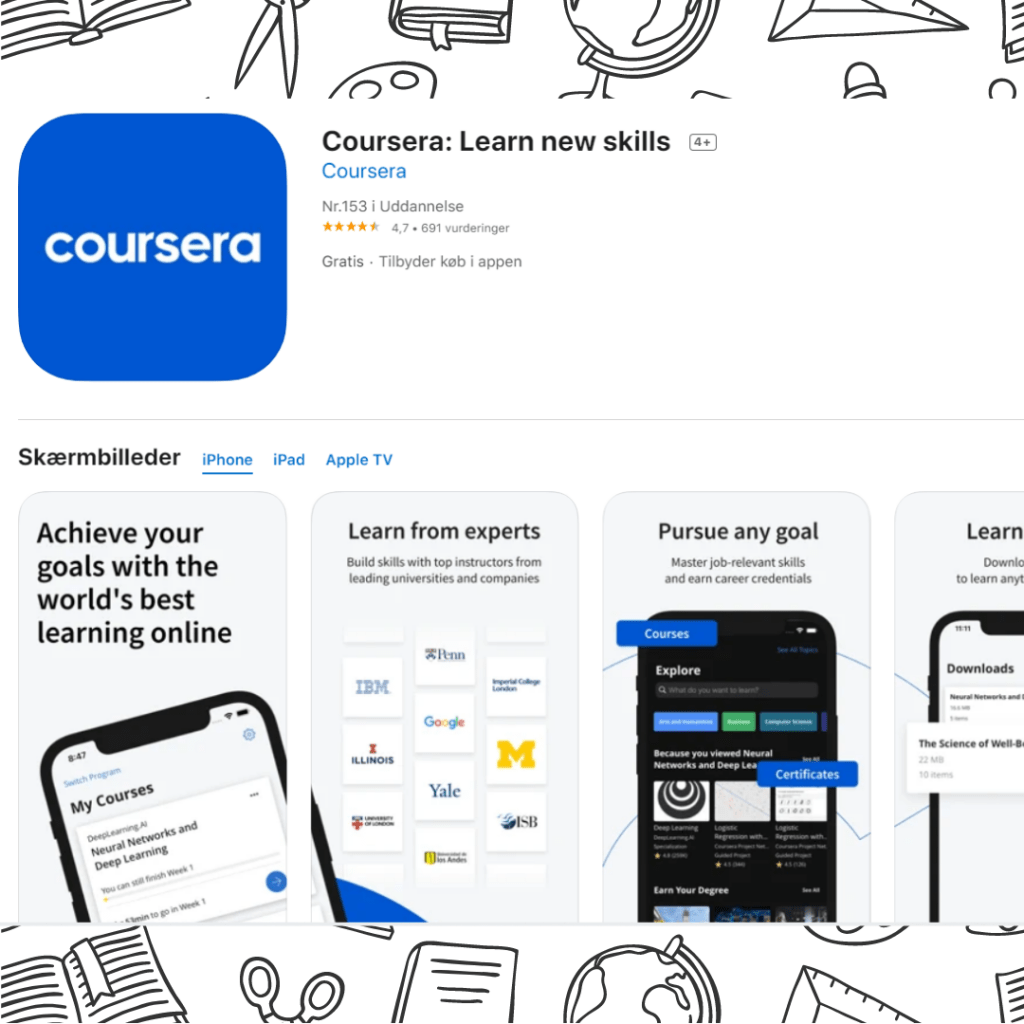 Du kan tage kurser i specialiseringer og få fulde akademiske grader fra nogle af de bedste universiteter i verden. Appen har også kurser fra IT-giganter, Google, IBM, Facebook og mange andre.