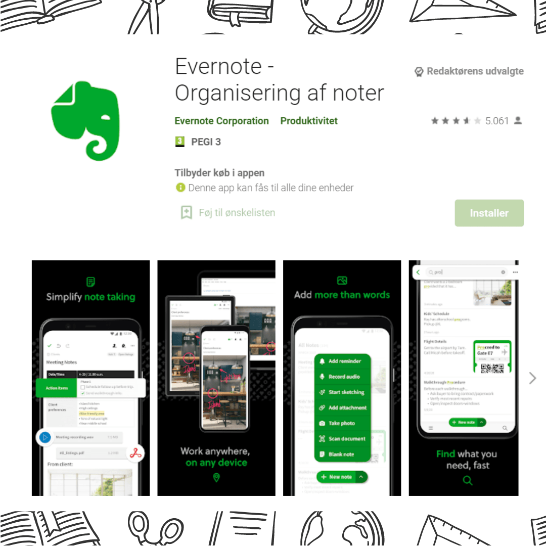 En af de bedste apps til at tage noter med, er Evernote. Du kan samle alle dine noter, mindmaps og andet studierelevant materiale ét sted. Evernote-appen lader dig lave digitale notesbøger, hvor du kan fremhæve relevante PDF-dokumenter, andre dokumenter, billeder og lydfiler, så dine digitale ting altid er organiseret.