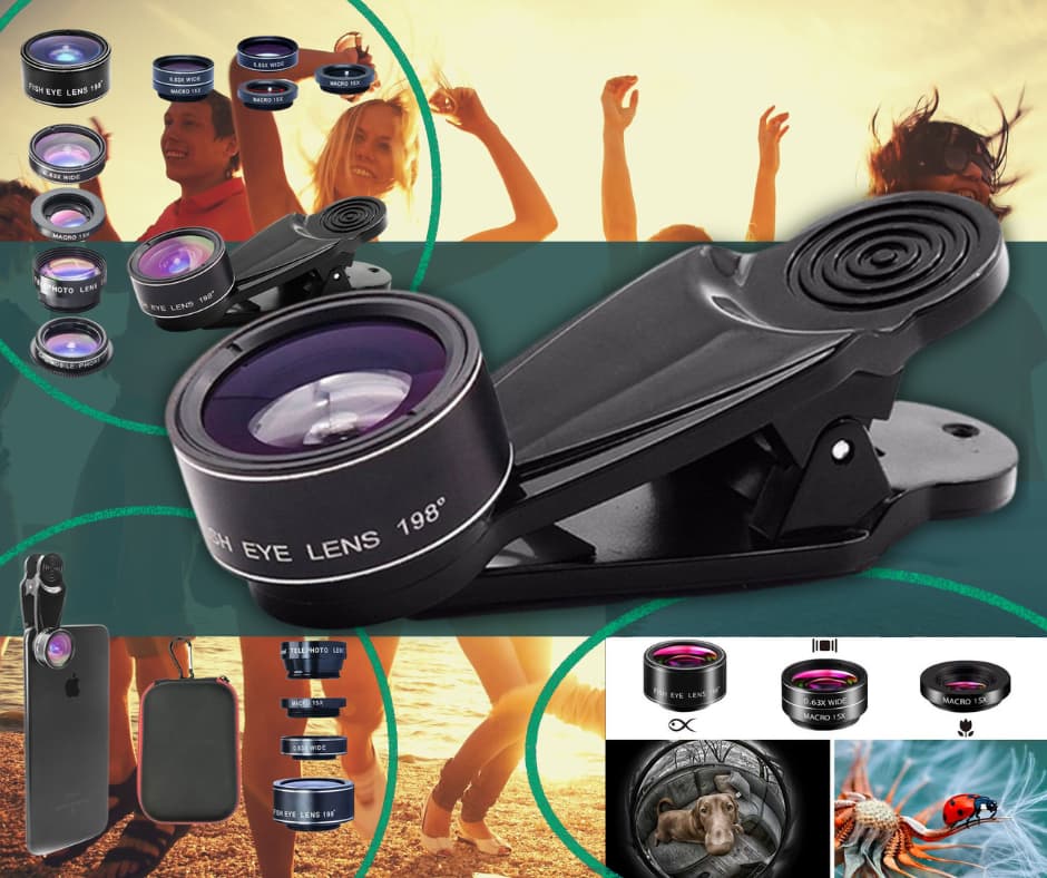 Sættet leveres med et 2X portrætobjektiv, 0,63X vidvinkelobjektiv, 15X makroobjektiv, 198-graders fisheye-objektiv og en CPL-polarisator. Alle disse linser kan fastgøres til kameraet på din smartphone med den medfølgende clip-on miniklemme.