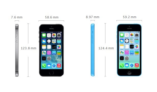 iPhone 5S og 5C er meget ens: iPhone 5C er lidt større, og lidt tungere. Her er målene på iPhone 5S – 123,8 x 58,6 x 7,6 mm, og på iPhone 5C 124,4 x 59,2 x 9 mm. iPhone 5S vejer 112 g mens 5C vejer 132 g.
