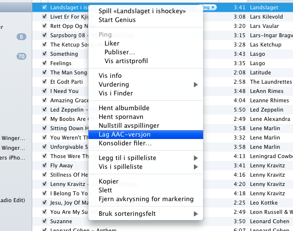 - 3. Højreklik på filen igen, og vælg «Lav AAC-version» og «Vis i finder». Hvis du ikke kan finde den nye fil, kan du søge efter den i søgefeltet oppe i højre hjørne i iTunesvinduet.