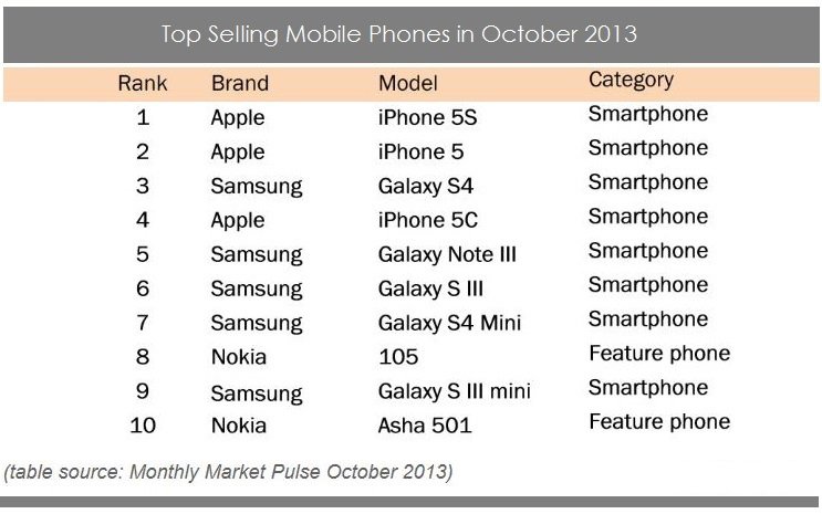Ifølge Counterpoint’s Monthly Market Pulse’s undersøgelse fortsætter Apples iPhone 5S med at være den telefon i verden, der sælger bedst. iPhone 5S salg har oplevet en utrolig fremgang og Apple har efterladt sin sydkoreanske konkurrent Samsung Galaxy S4 langt bagude. Efter iPhone 5S på listen ligger dens forgænger, iPhone 5, mens den farverige iPhone-version 5C indtager fjerdepladsen.