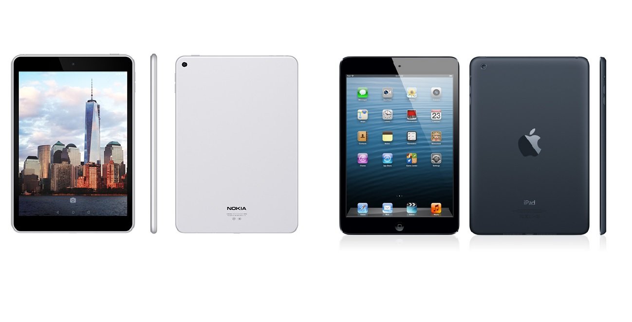 Når det gælder udseende, er de to tablets selvfølgelig meget ens: begge har afrundede kanter, aluminiumschassis og kamera, knapper og porte på (næsten) samme steder. Men Nokias tablet er tyndere og lettere end iPad mini 3: den vejer 318 gram og måler 200,7 x 138,6 x 6,9.