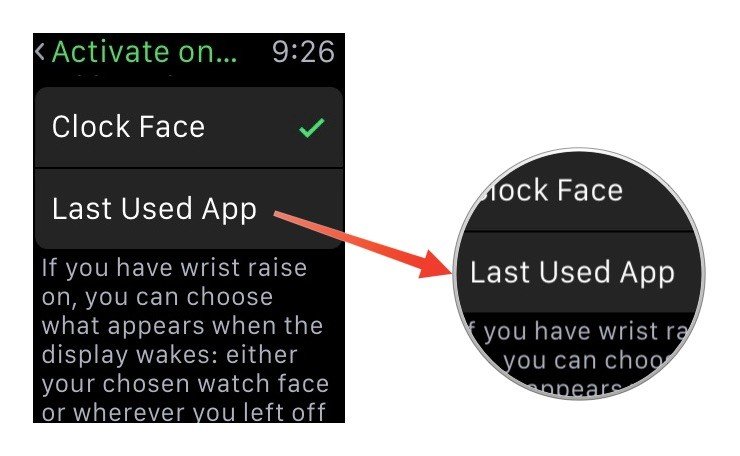 Når du bevæger din arm, vil Apple Watch automatisk vågne og vise klokkeslettet. Hvis du i stedet ønsker at den skal vise den applikation du brugte før den gik i dvaleindstilling, kan du indstille dette ved å gå til Indstillinger > Generelt > Aktiver når håndled bevæges > På, og vælg derefter Åbn sidst brugte app.