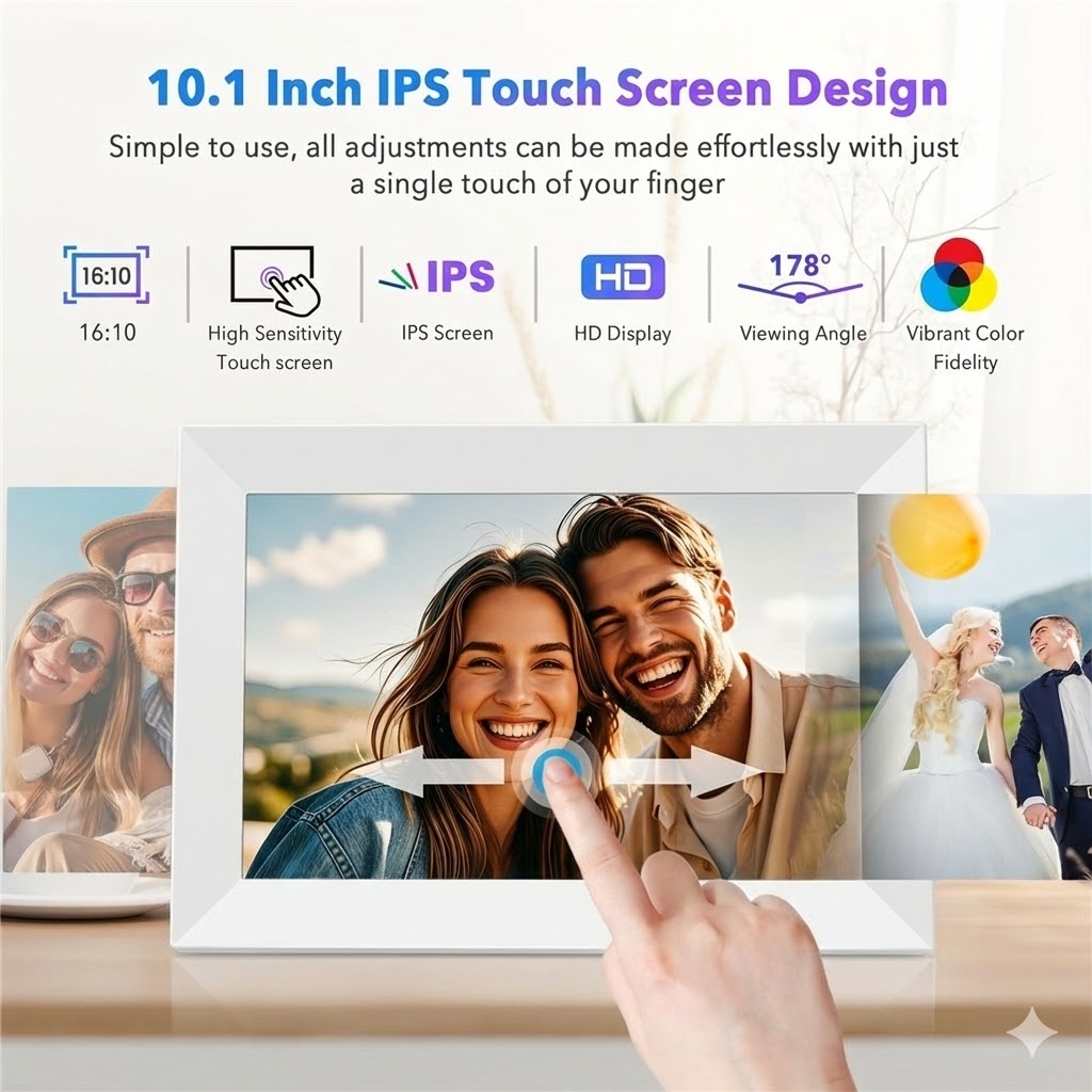Nyd dine minder i levende klarhed med en 10.1" IPS-berøringsskærm med en opløsning på 1280 × 800 og en bred betragtningsvinkel på 178°. Perfekt til fotos, videoer og diasshows med fyldige farver og flotte detaljer.