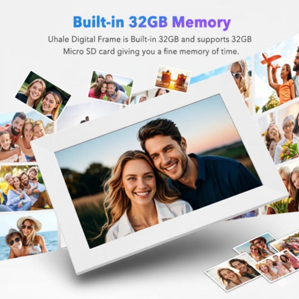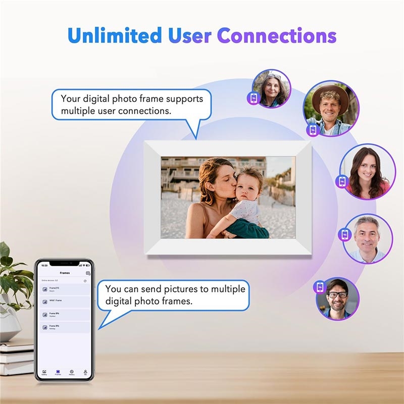 Denne 10.1" WiFi-digitale fotoramme leverer skarp skærmkvalitet, smart trådløs deling, generøs opbevaring og flerbrugertilslutning, hvilket gør den til den perfekte moderne løsning til familier, kontorer eller som en betænksom gave.