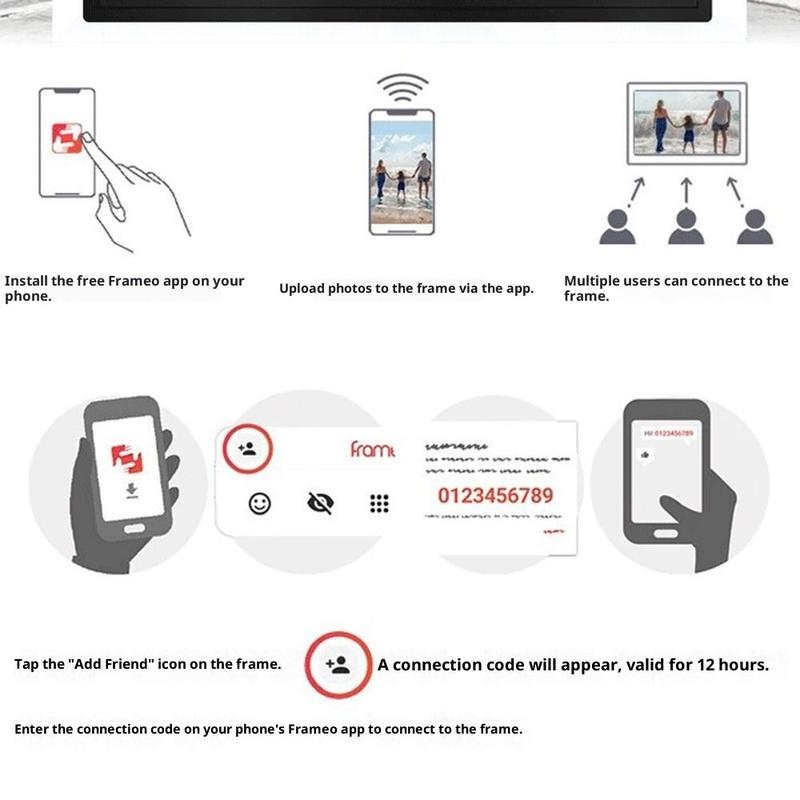 Med indbygget WiFi er det nemt at overføre og opdatere fotos. Upload direkte via appen, opret album, eller inviter flere brugere til at bidrage, så rammen bliver et delt fotogalleri i udvikling.