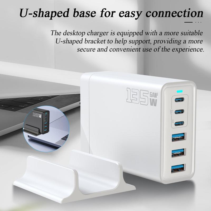 135W GaN bordoplader / 6-ports højhastighedsopladningsstation - 3x USB-C, 3x USB-A