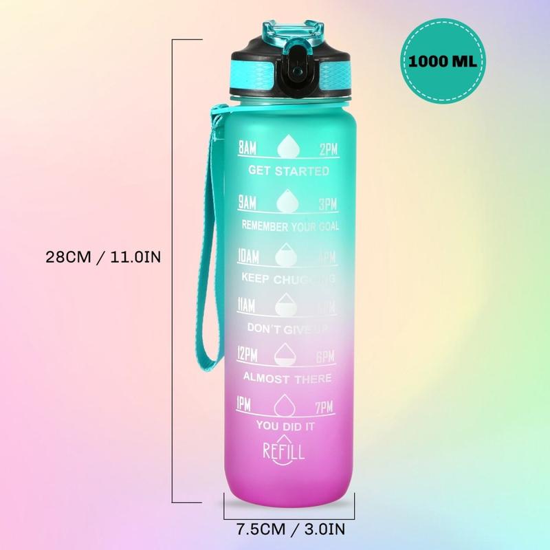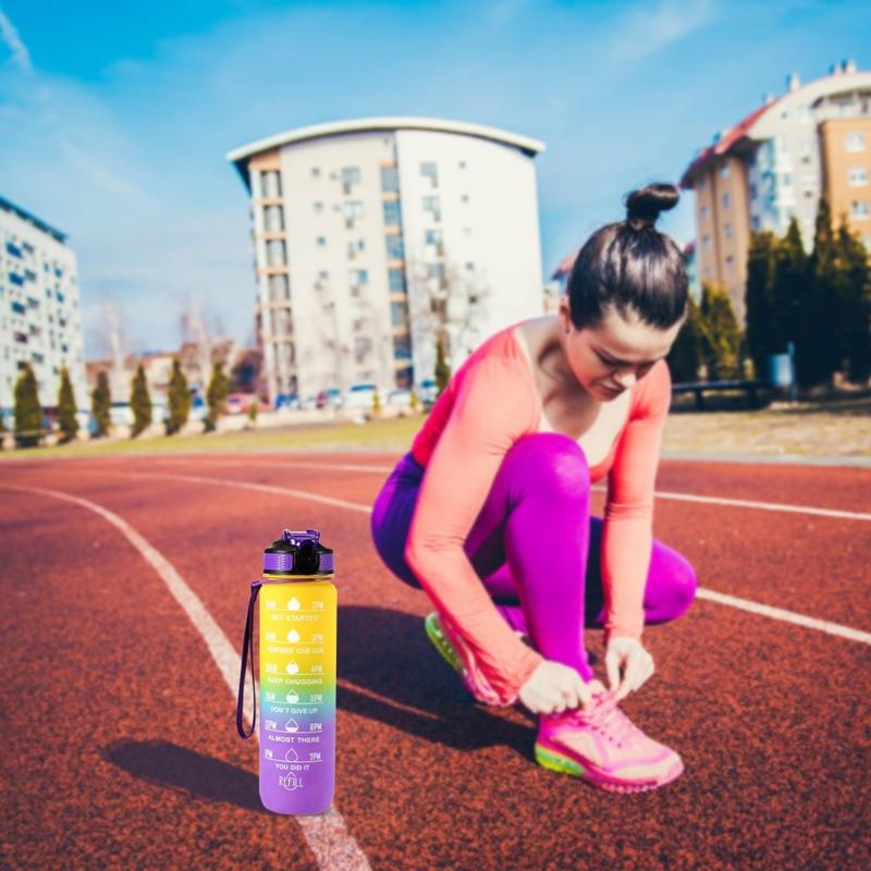 Denne 1-liters sportsvandflaske er designet til at hjælpe dig med at holde dig hydreret hele dagen. Med tidsmarkeringer og inspirerende citater fungerer den som en påmindelse om at opretholde dit daglige væskeindtag. Fremstillet af miljøvenlige, BPA-fri og fødevaregodkendte materialer sikrer flasken sikker og lugtfri brug. Dens lækagesikre design, silikonesugerør og holdbare nylonrem gør den praktisk til forskellige aktiviteter, herunder træning, løb, vandreture, cykling, camping, yoga og meget mere.
