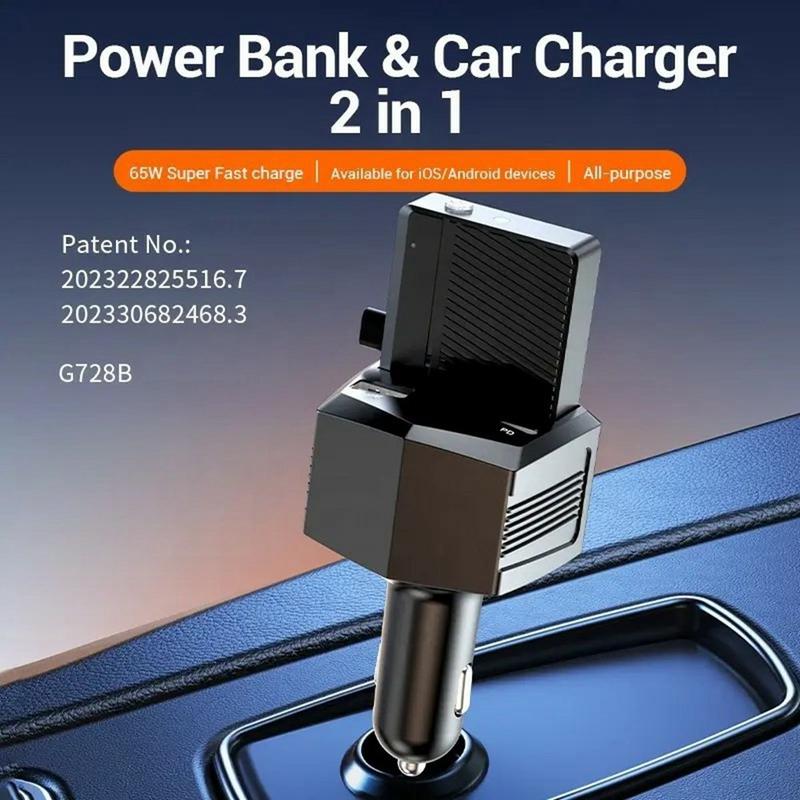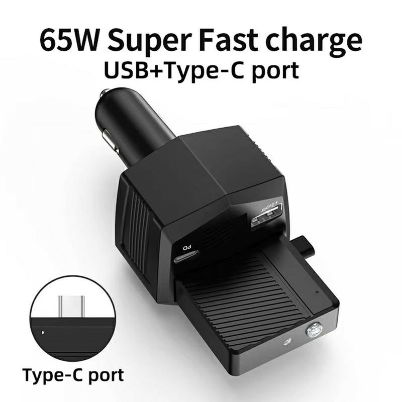 2-i-1 65W hurtig biloplader med USB-C PD, USB-A-porte og 2000mAh USB-C powerbank med lommelygte