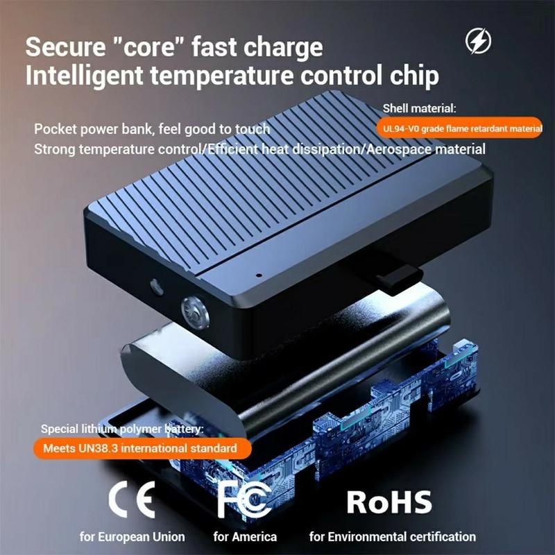 - Indikatorlys for powerbank: Hvidt lys blinker for at indikere opladning; konstant hvidt lys indikerer fuld opladning; hvidt lys tændt under afladning; hvidt lys blinker ved lavt batteriniveau.
