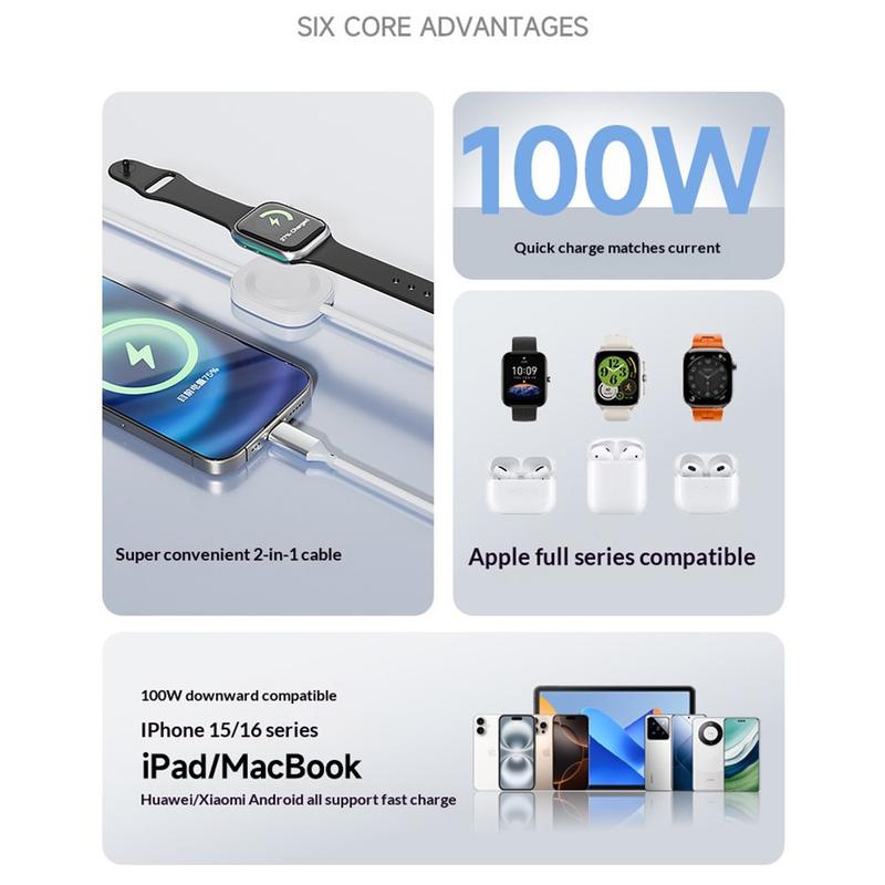 Dette 2-i-1-hurtigopladningskabel eliminerer rod ved at kombinere et kraftigt 100W PD-stik med en magnetisk Apple Watch-oplader. Den stærke magnet sikrer perfekt, bekymringsfri justering, mens kobberkernen forbedrer effektiviteten og beskytter enhedens batterier under hurtig opladning. Den brede protokolkompatibilitet gør det ideelt til brugere med flere enheder - det giver hastighed, bekvemmelighed og langsigtet pålidelighed i ét kompakt tilbehør.