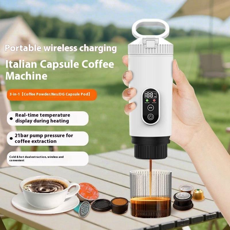 3-i-1 bærbar espressomaskine - trådløs elektrisk kapselkaffemaskine med 7500 mAh batteri til bil, hjem og udendørs - kompatibel med Nespresso, DolceGusto-kapsler, kaffepulver