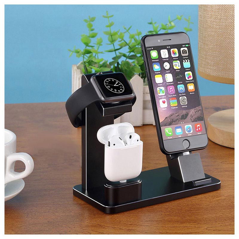 Dette praktiske opladerstativ gør at du kan opbevare din iPhone, Apple Watch og AirPods samlet samme sted. Du kan oplade dem alle med dine opladere og kabler. Alle enheder holdes i en perfekt synsvinkel.