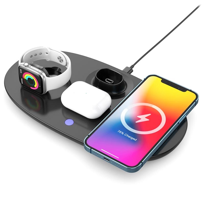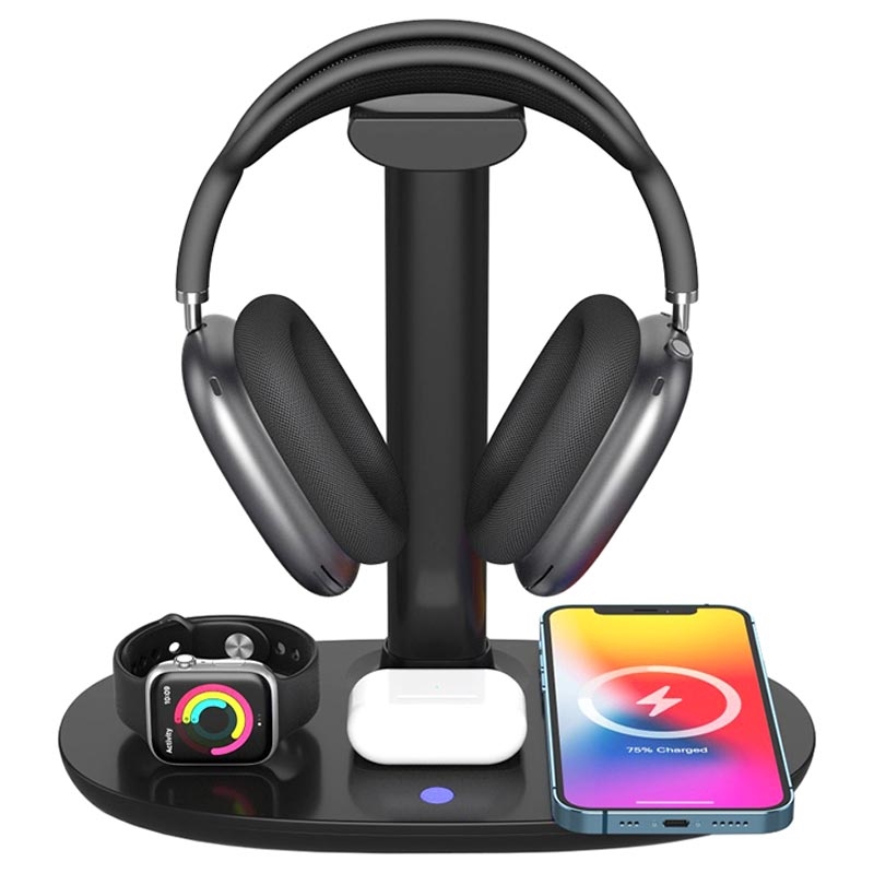 dockingstation lader dig oplade din iPhone, dit Apple Watch og dine AirPods hurtigt og samtidigt, mens de bliver opbevaret sammen med dine over-ear hovedtelefoner. Dit bord og dine moderne gadgets vil altid se organiserede ud på denne trådløse opladningsstation. Holderen til hovedtelefonerne kan tages af og fjernes uden besvær, når du ikke bruger den eller gerne vil pakke hele stativet ned i en taske og tage det med på farten.