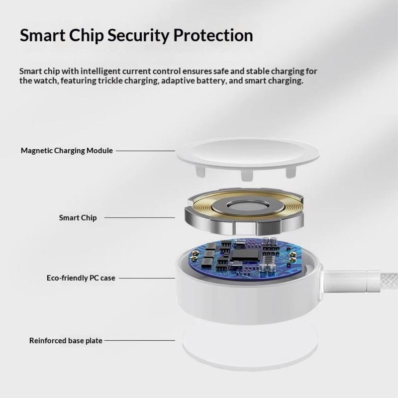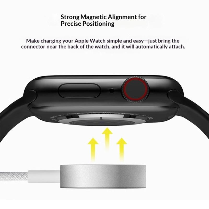 Det magnetiske opladningsdesign muliggør ubesværet justering med kompatible enheder. Du skal blot placere dit Apple Watch på opladeren, så klikker det fast i den rigtige position, hvilket sikrer stabil kontakt og effektiv strømoverførsel.