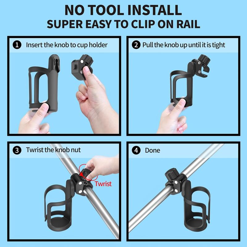 360-graders drejelig flaskeholder med hurtigudløserknap - universal klemmemontering til flasker op til 8 cm, passer til rør på 1,5-4,2 cm