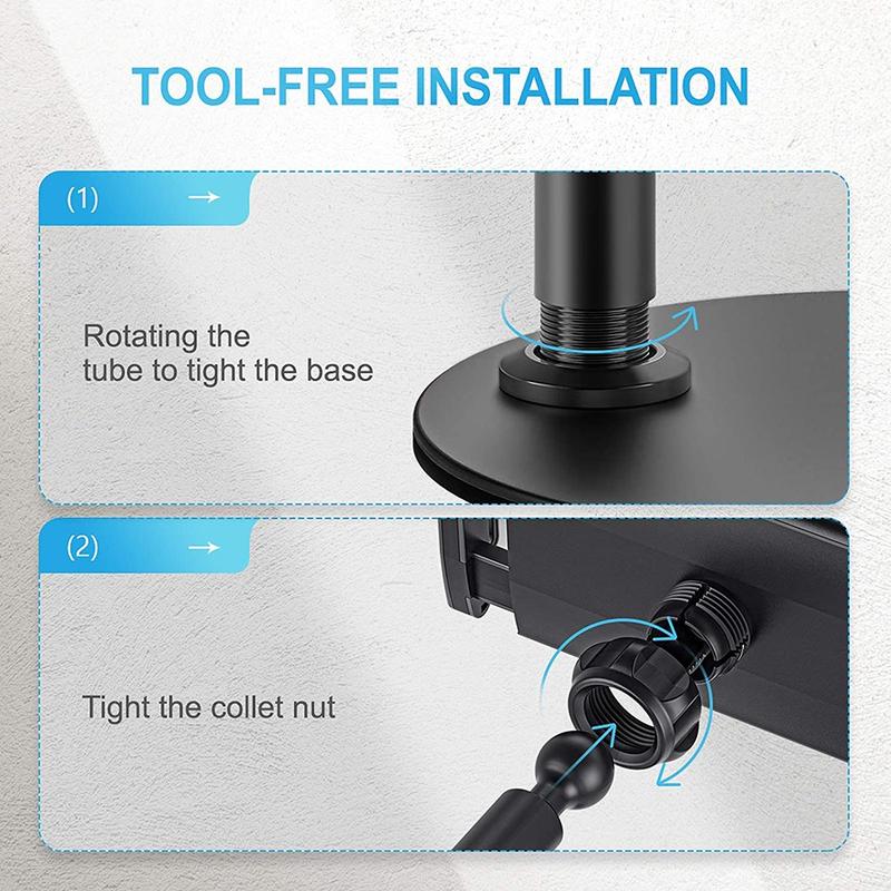 Værktøjsfri installation, bare drej røret for at stramme basen, og stram derefter spændemøtrikken