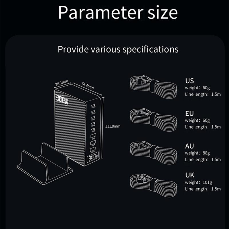 Sæt strøm til hele dit setup med en højtydende 380W GaN-skrivebordsladestation, der er bygget til moderne hjem og kontorer. Med 8 porte (5x USB-C + 3x USB-A) og et digitalt strømdisplay kan du oplade bærbare computere, telefoner, tablets, hovedtelefoner, powerbanks og meget mere på samme tid - samtidig med at du holder skrivebordet rent og organiseret. GaN-teknologi hjælper med at levere stærk ydeevne i en kompakt form, og indbygget sikkerhedsbeskyttelse hjælper med at holde opladningen stabil og pålidelig.