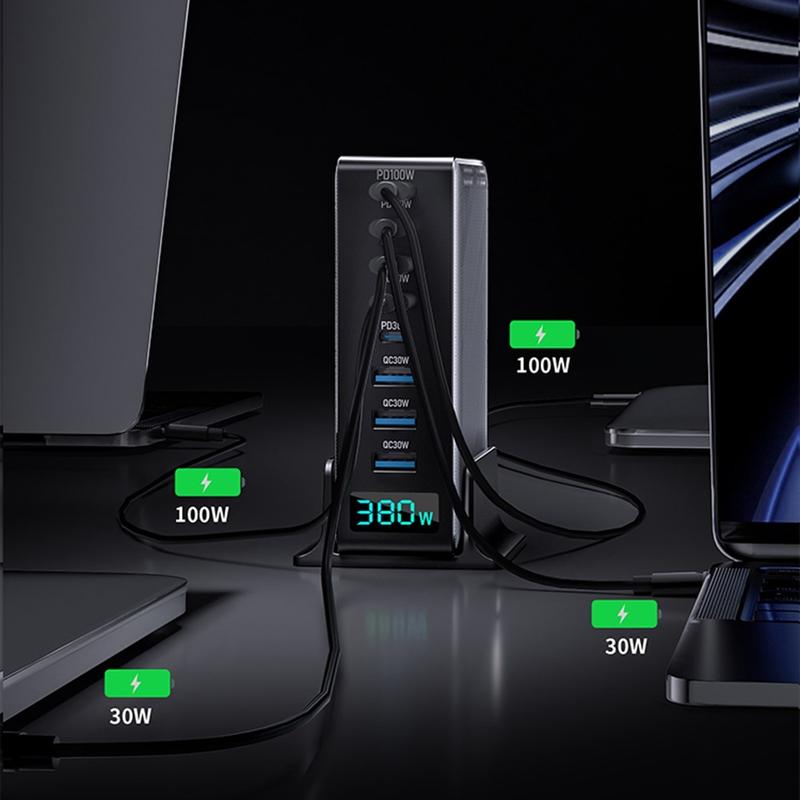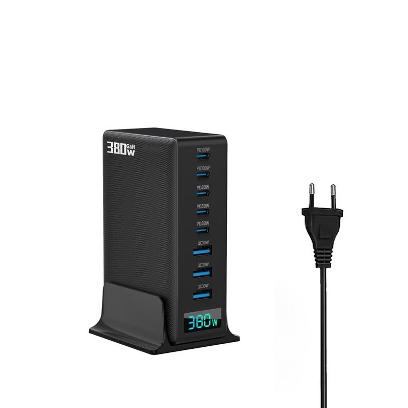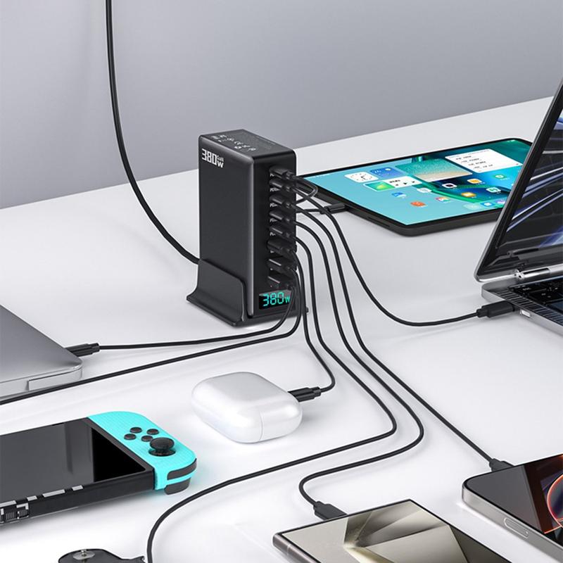 380W GaN stationær ladestation med digitalt strømdisplay - 8 porte (5x USB-C + 3x USB-A), op til 100W USB-C hurtigoplader
