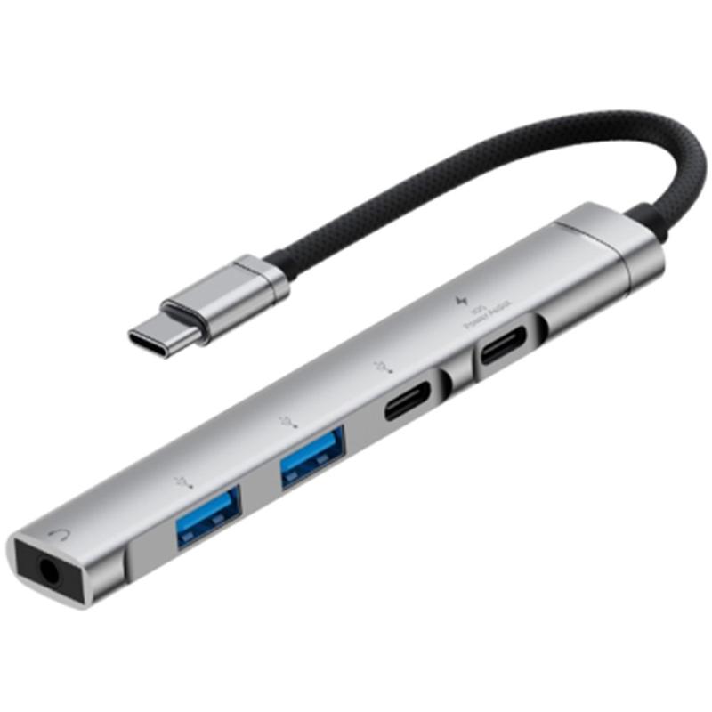 5-i-1 multifunktionel USB-C-hub i aluminiumslegering - 1x Type-C-opladningsport, 1x Type-C-dataport, 2x USB 2.0, 3,5 mm hovedtelefonstik