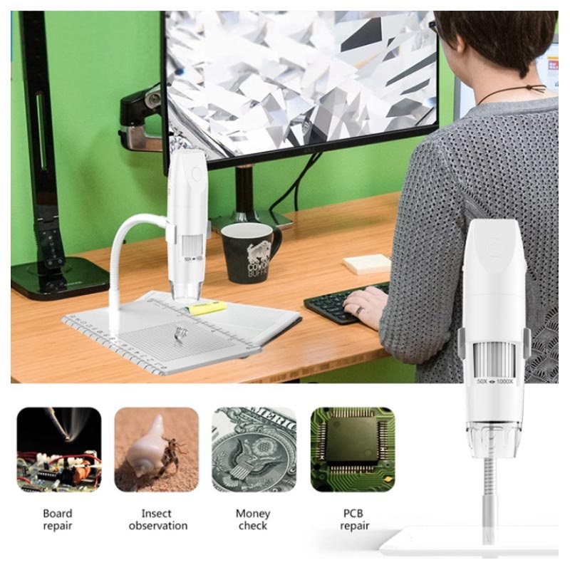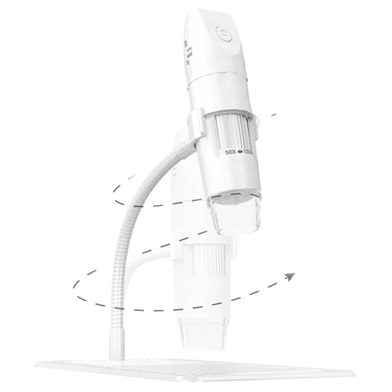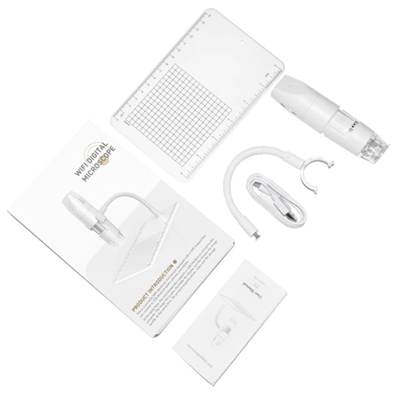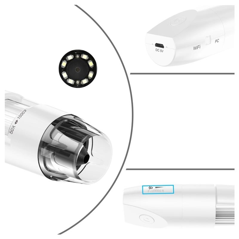 Det har 8 justerbare LED-lys som giver optimal klarhed, mens du kan se imponerende detaljer af 3D prøver med det 2MP store kamera - se eksempelvis mange detaljer på insekter, mønter og smykker. Du kan se alle detaljerne takket være en forstørrelse fra 50 til 1000 gange. Tilslut det digitale mikroskop via Wi-Fi med din Android eller iOS enhed, eller med en Windows eller Apple computer. Når der ikke er en Wi-Fi forbindelse til rådighed, kan du bruge microUSB kablet til at danne par med en USB enhed.