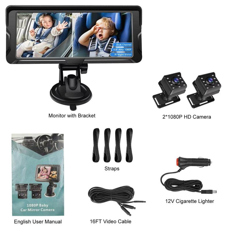 6,8 tommer babymonitor til bilen - to 1080P HD-kameraer med 360 graders rotation, vidvinkelvisning og infrarødt nattesyn