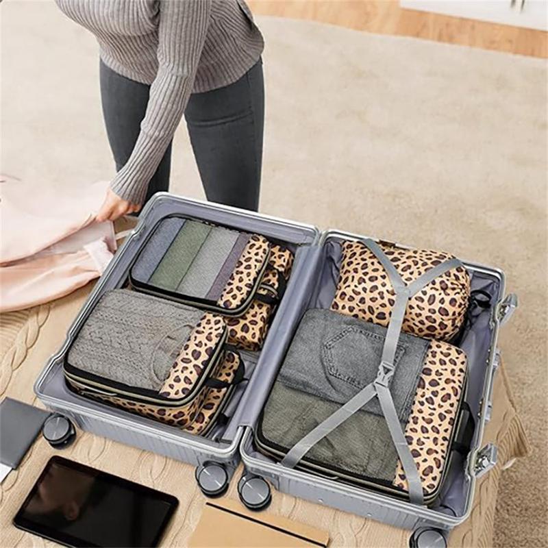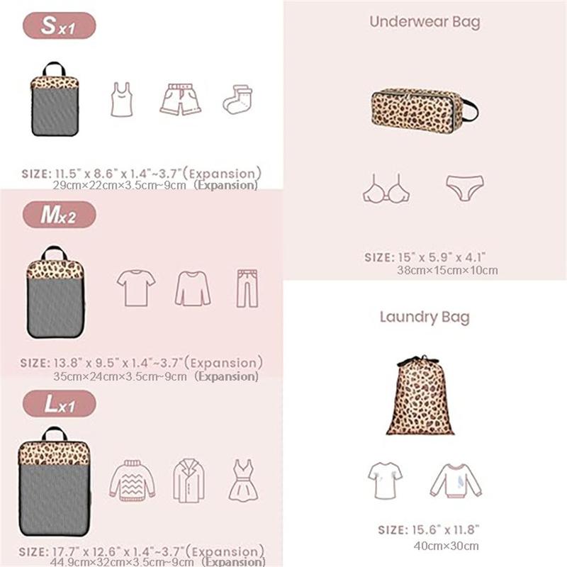 Det 6-delte leopardmønstrede rejsearrangørsæt kombinerer mode, funktion og effektivitet. Med sit iøjnefaldende design, slidstærke nylonkonstruktion og smarte kompressionssystem er det den ultimative organizer til stressfri rejser.