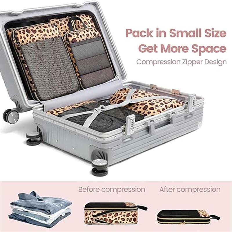 6-delt rejseorganizersæt med leopardprint - pladsbesparende kompressionstasker til tøj og toiletsager