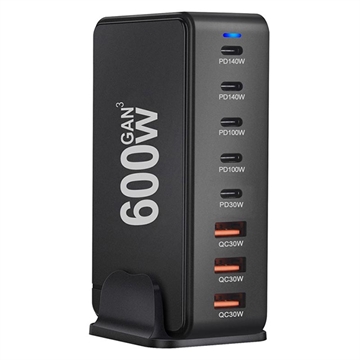 600W GaN Desktop-Ladestation - 8 porte (5x USB-C + 3x USB-A) PD3.1 hurtigoplader, op til 140W USB-C, intelligent strømfordeling