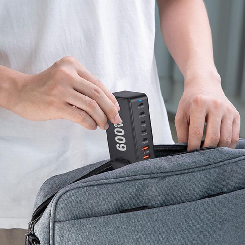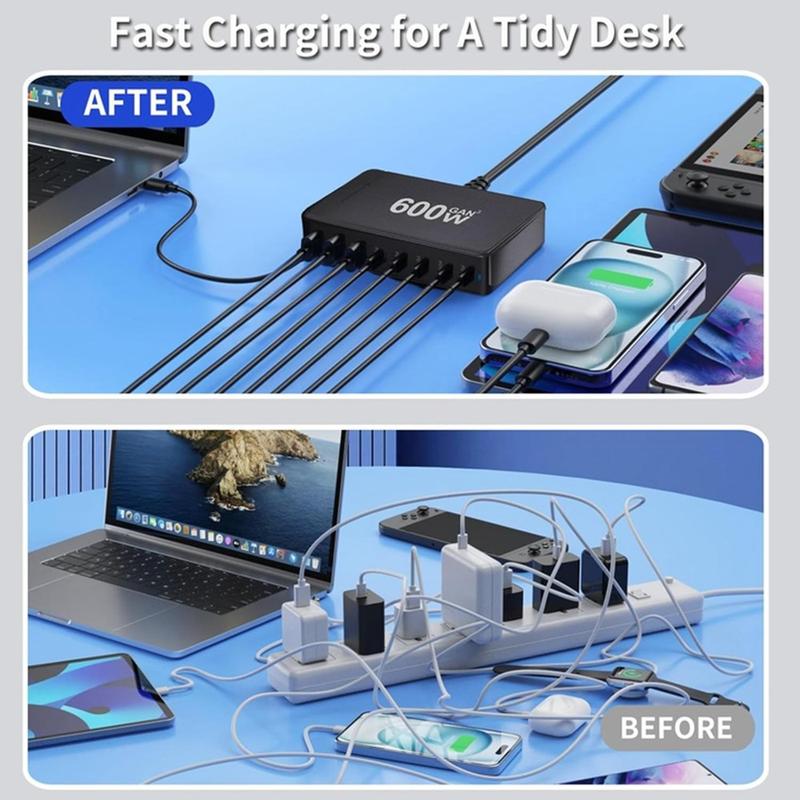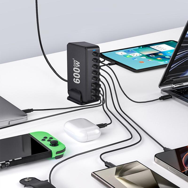 Giv strøm til hele dit setup fra én kompakt hub. Denne 600W GaN-ladestation til skrivebordet er bygget til travle skriveborde, delte husstande og teknologitunge rejsesæt, så du kan oplade op til 8 enheder på én gang. Med 5 USB-C-porte og 3 USB-A-porte er den klar til alt fra kraftige USB-C-laptops til telefoner, tablets, ørepropper og powerbanks. Understøttelse af PD3.1 og QC3.0 sikrer hurtig opladning af kompatible enheder, mens intelligent strømfordeling automatisk tilpasser output afhængigt af, hvad der er tilsluttet. Sikkerhedsbeskyttelse i flere lag hjælper med at holde opladningen stabil og bekymringsfri, selv når flere enheder er tilsluttet.