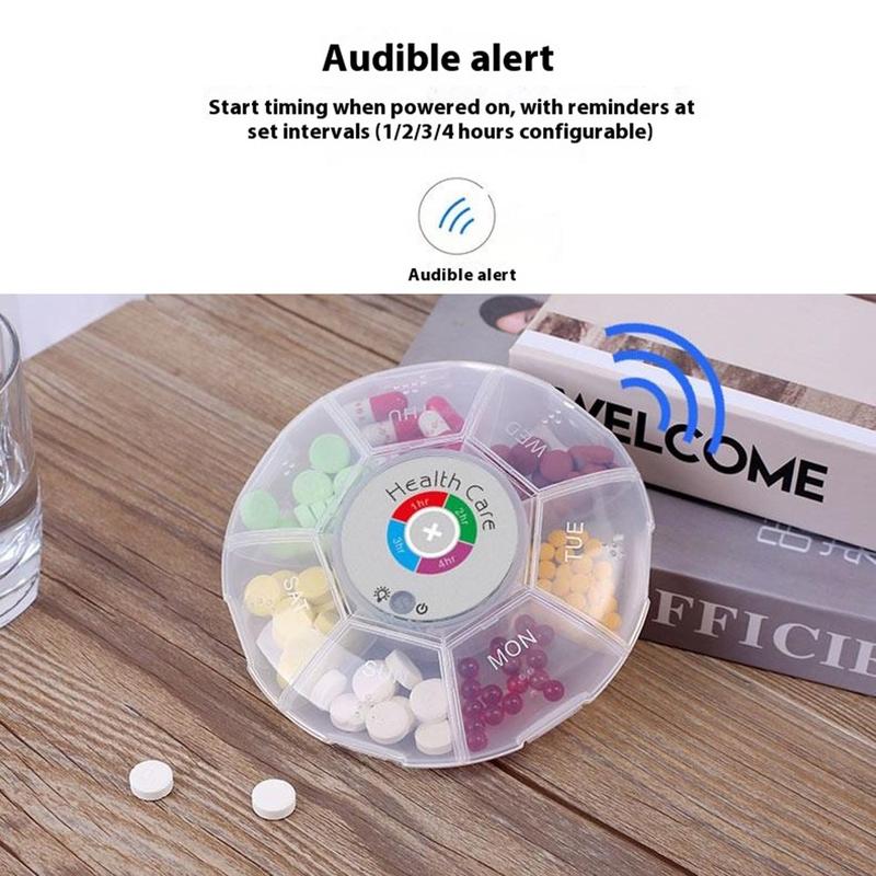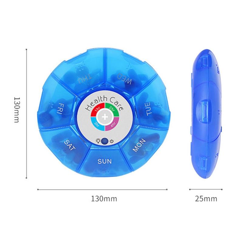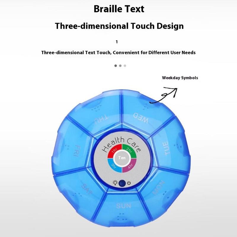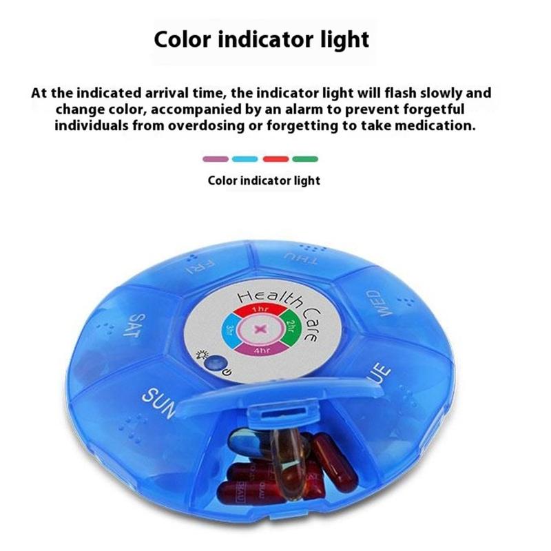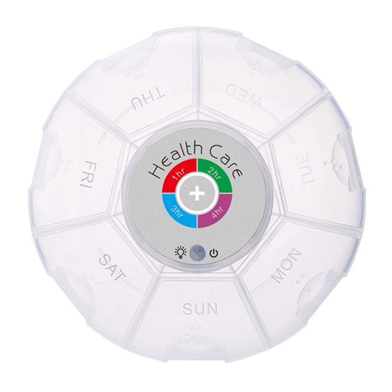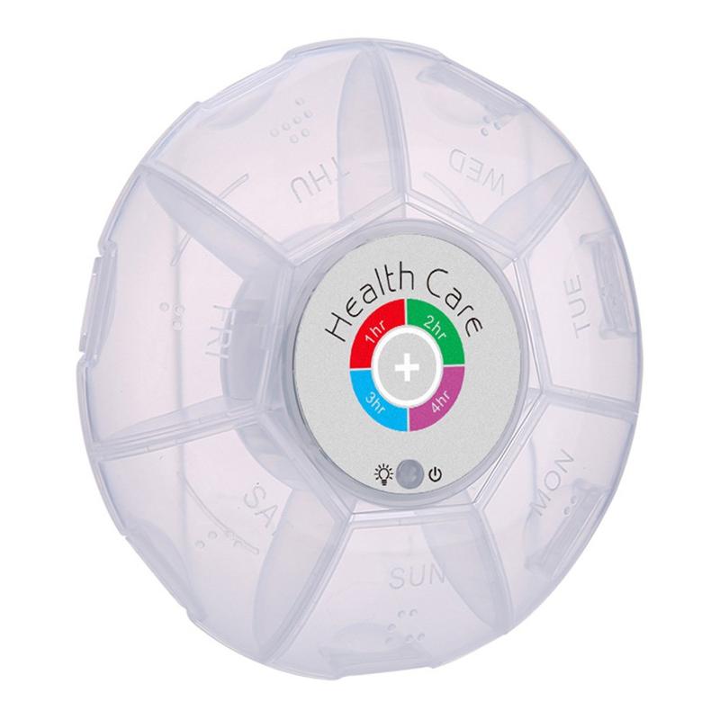 Hold styr på hver eneste dosis - selv når du er ude at rejse. Denne runde pilleæske med syv rum kombinerer farveskiftende lysdioder med lydalarmer, så du kan programmere op til fem påmindelser med 1-, 2-, 3- eller 4-timers intervaller. Blindeskrift og hævede ugedagsikoner holder layoutet inkluderende, mens en fugtbestandig, slagfast skal beskytter tabletter i en håndtaske eller håndbagage.