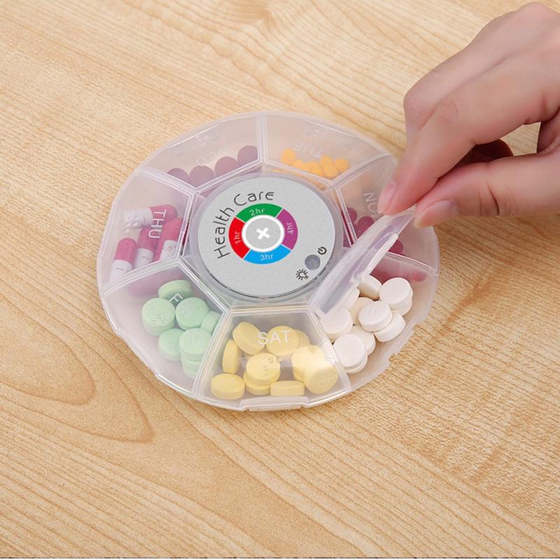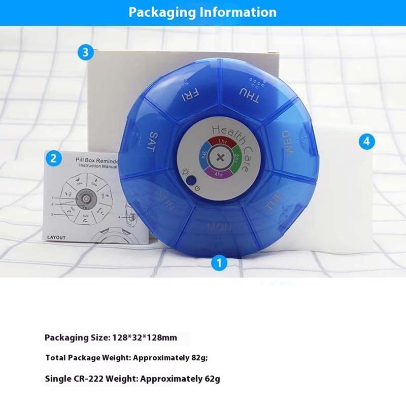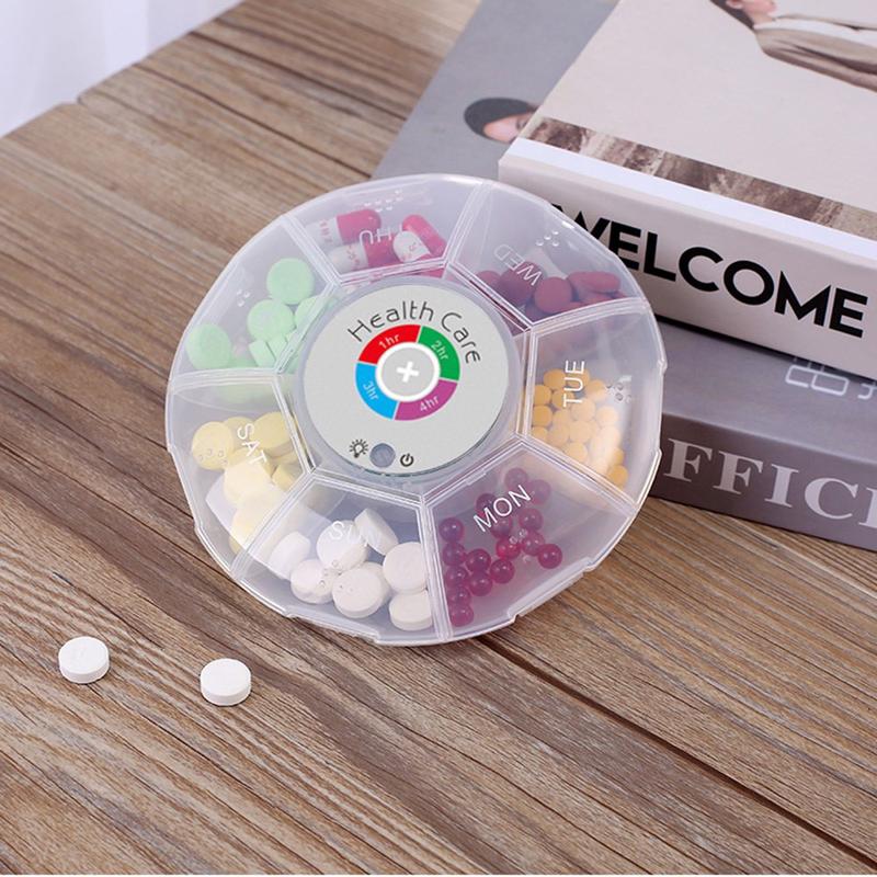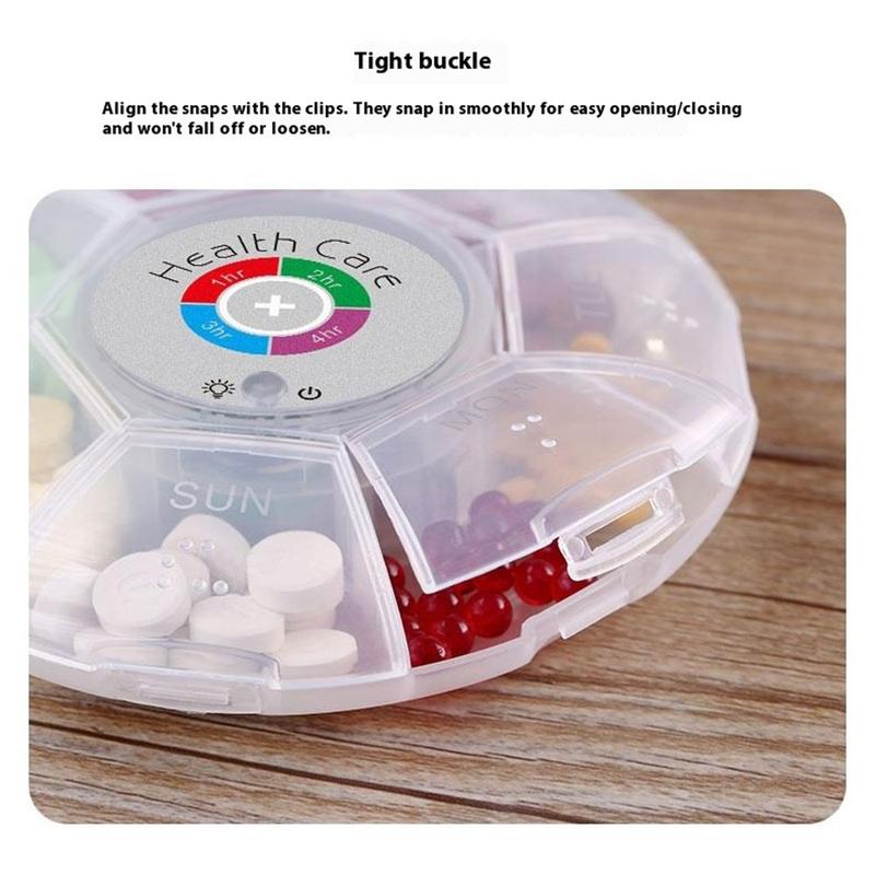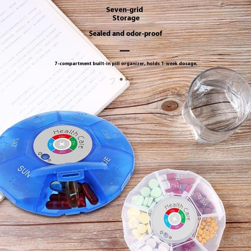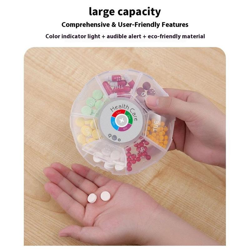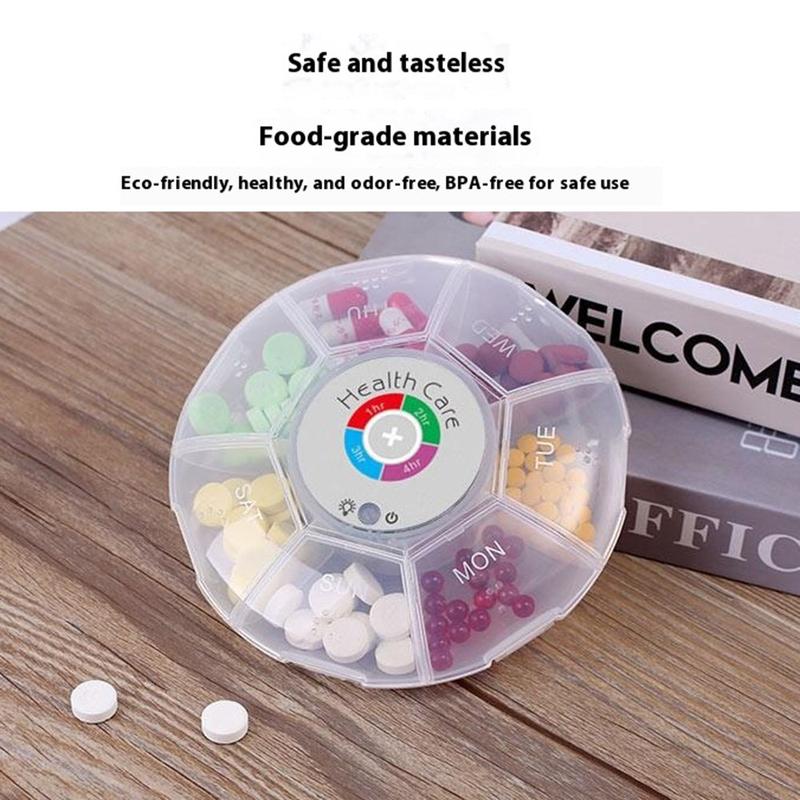 Hold styr på hver eneste dosis - selv når du er ude at rejse. Denne runde pilleæske med syv rum kombinerer farveskiftende lysdioder med lydalarmer, så du kan programmere op til fem påmindelser med 1-, 2-, 3- eller 4-timers intervaller. Blindeskrift og hævede ugedagsikoner holder layoutet inkluderende, mens en fugtbestandig, slagfast skal beskytter tabletter i en håndtaske eller håndbagage.