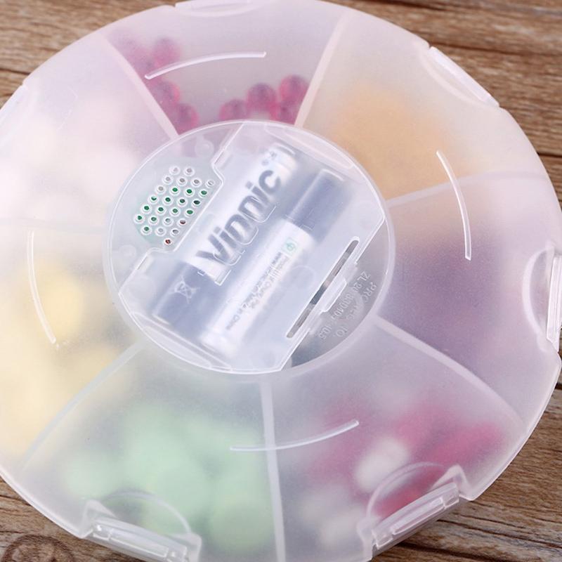 - 7 forseglede rum - et klik roterer til næste dosis; indvendige låg holder forskellige tabletter friske og adskilte.