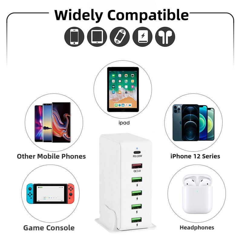 Med en PD-port, en QC3.0-port og fire ekstra USB-A-udgange kan du oplade flere enheder samtidig - perfekt til arbejdsstationer, familier eller rejsende, der har flere gadgets med sig.