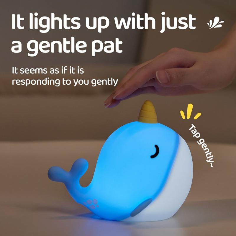 Narhvalen er fremstillet af førsteklasses, hudvenlig silikone og er skabt til at blive rørt ved, klemt og holdt om. Dens bløde tekstur og varme glød gør den til en dejlig stresslindrende følgesvend, der er ideel til at lindre angst eller hjælpe de små med at slappe af ved sengetid.