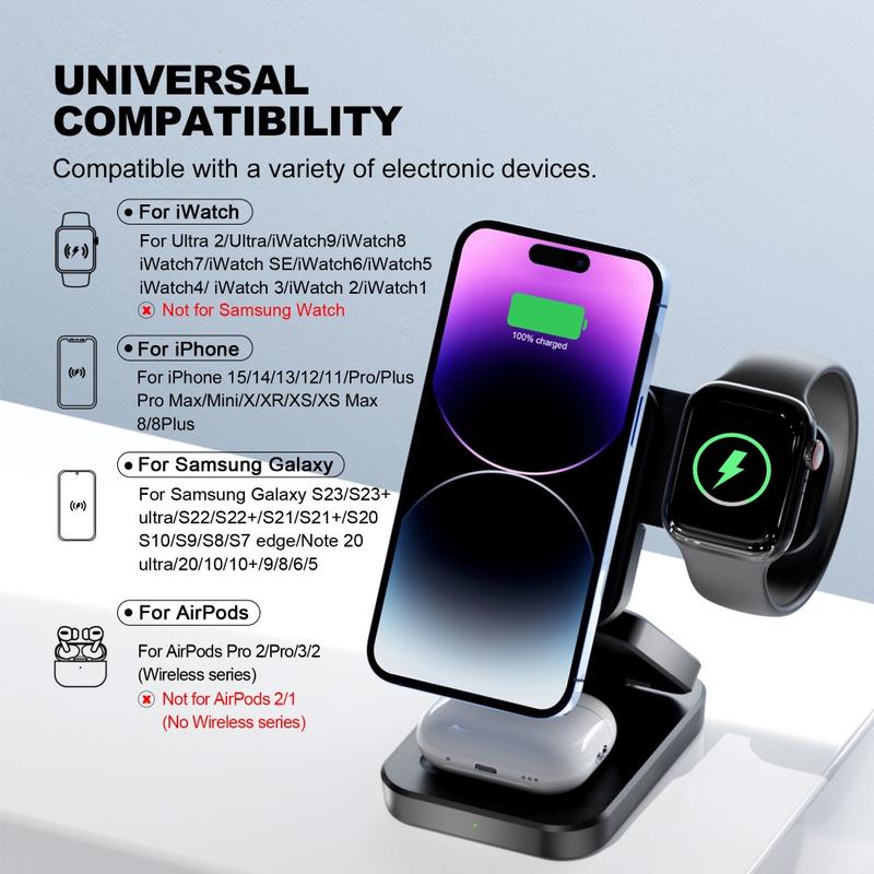 - 3-i-1 trådløs opladning - Understøtter samtidig opladning af smartphones, Apple Watch og AirPods, så alle dine enheder er klar til brug.