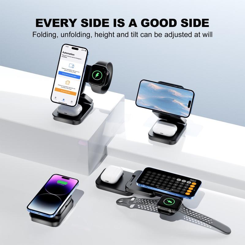 Hold dig opladet med A390 3-i-1 magnetisk trådløs oplader, der er designet til at oplade din iPhone, Apple Watch og AirPods samtidigt. Med stærk magnetisk justering, hurtig trådløs opladning og et sammenklappeligt, rejsevenligt design er denne kompakte ladestation perfekt til brug i hjemmet, på kontoret eller på farten. Den er lavet af holdbart ABS-materiale og sikrer langvarig ydeevne, samtidig med at den reducerer rodet fra flere kabler.