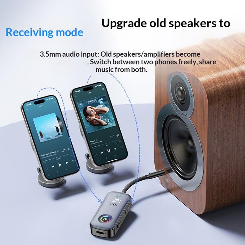 A6 Pro fungerer både som Bluetooth-modtager og -sender, så du kan tilslutte to smartphones eller to par Bluetooth-hovedtelefoner på samme tid. Ideel til at dele musik eller opgradere billydsystemer uden Bluetooth.