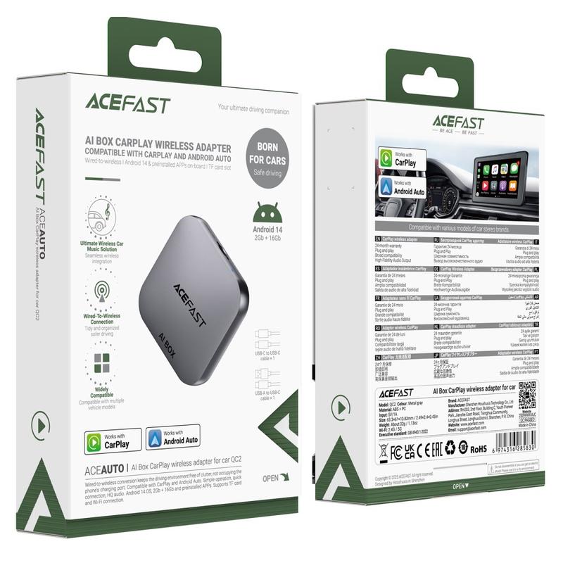 ACEFAST QC2 AI Box giver din bil en øjeblikkelig moderne opgradering uden at udskifte din hovedenhed. Dens hurtige trådløse tilslutning, underholdningsmuligheder, bærbare design og udvidede lagerplads gør den til en fremragende løsning for bilister, der ønsker bekvemmelighed, komfort og fleksibilitet. Uanset om du navigerer, streamer eller tager imod opkald håndfrit, forbedrer denne kompakte adapter enhver rejse.
