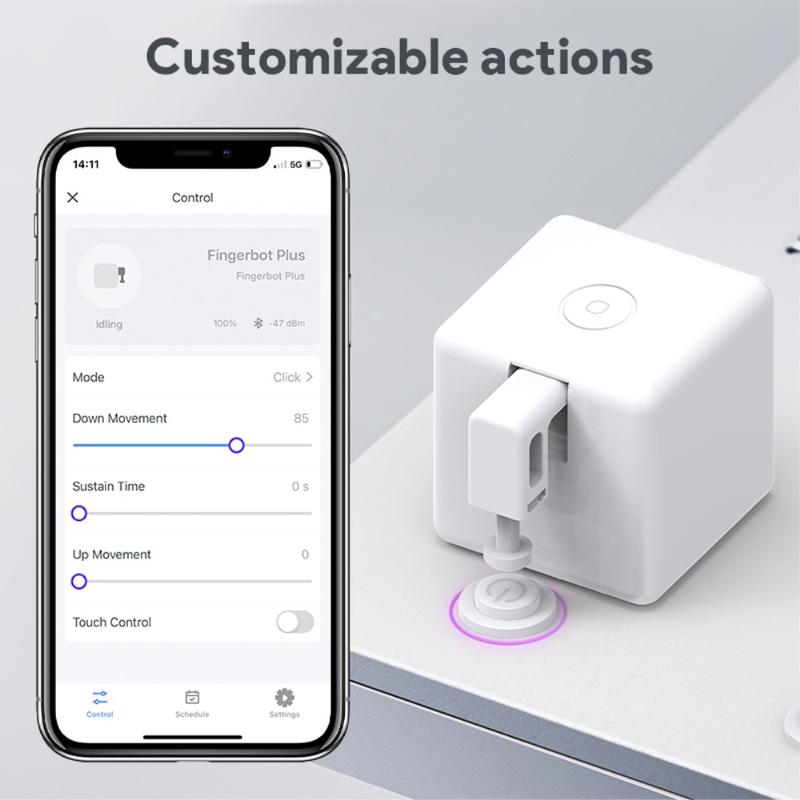 Fingerbot Plus kan automatisere stort set alle enheder med en fysisk knap - fra kaffemaskiner og klimaanlæg til vægkontakter og bordelektronik. Dens præcisionsmotor og tilpassede trykafstand gør, at den kan tilpasses utallige brugssituationer og bygger bro mellem traditionelle apparater og moderne smart-home-teknologi.