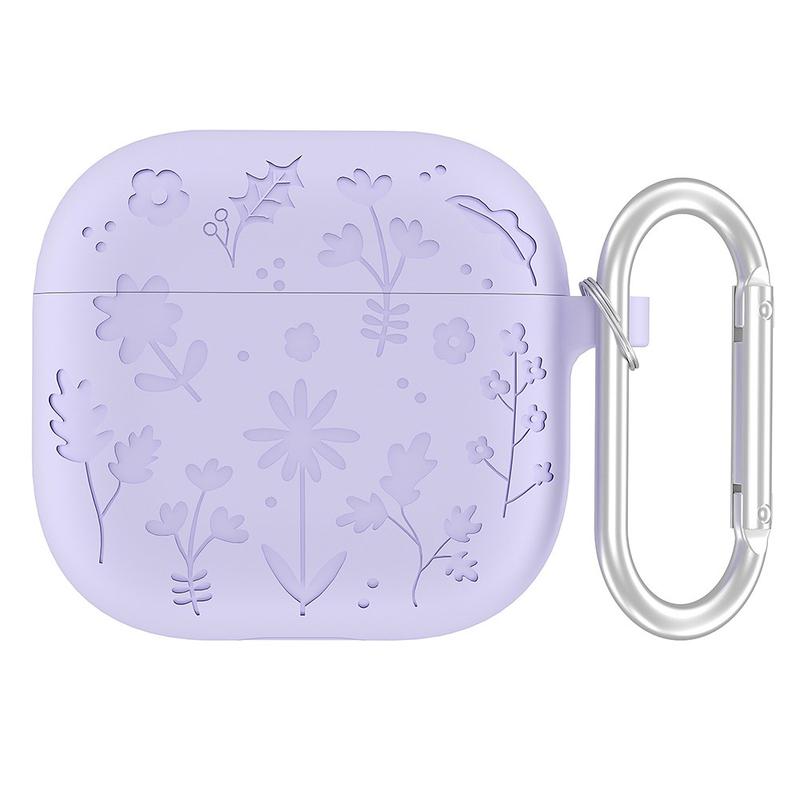 AirPods 4 flydende silikoneetui med blomstermønster og karabinhage - lyslilla