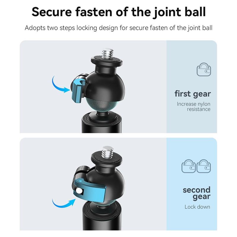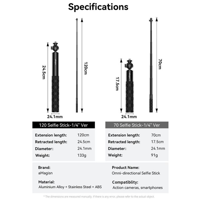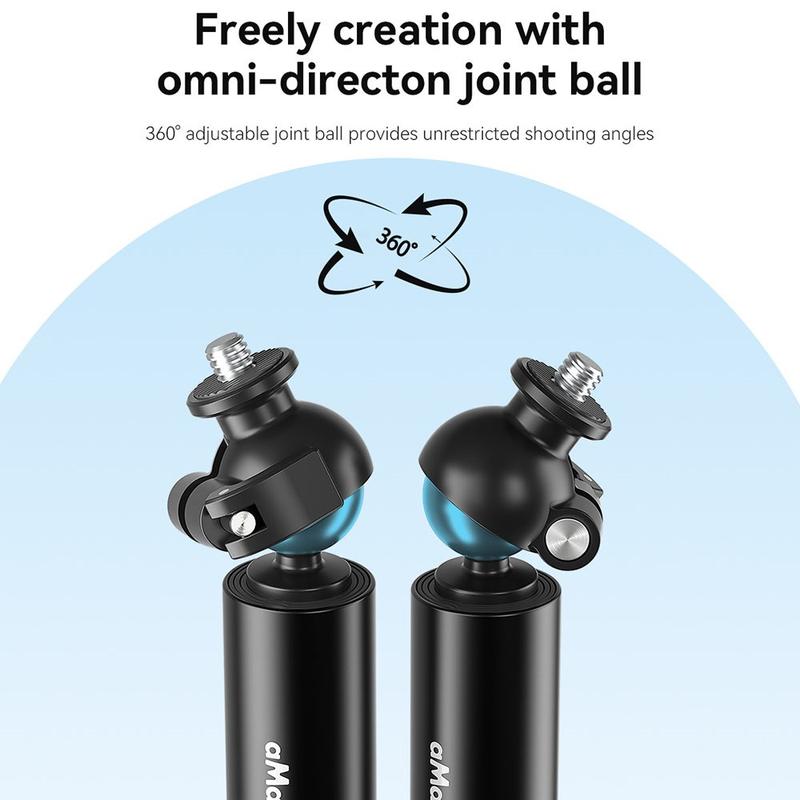 Fang alle vinkler med AMAGISN 120cm Sports Camera Selfie Stick, der er designet til DJI-, GoPro- og Insta360-kameraer. Med en 360° vinkelfri justering giver denne selfie-stang kreativ frihed og perfekte billeder fra ethvert perspektiv. Den er bygget af aluminium i luftfartskvalitet og er både holdbar og let, hvilket gør den ideel til brug på farten. Låsemekanismen med to hastigheder sikrer stabilitet, mens skruen i rustfrit stål giver sikker fastgørelse. Kompatibel med stativer takket være 1/4"-gevindforbindelsen.