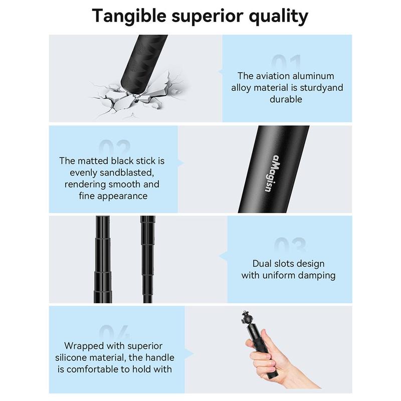 AMAGISN 120cm Sports Camera Selfie Stick er ideel til fotografer og videografer, der har brug for et holdbart, justerbart og bærbart værktøj til at indfange hvert øjeblik med præcision og kreativitet.