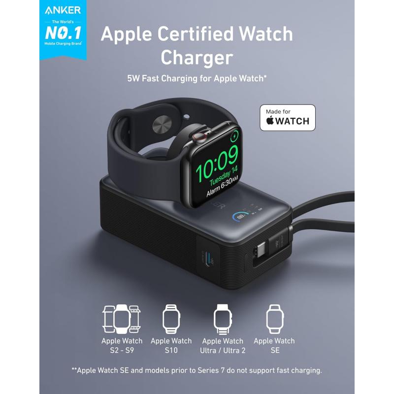 Anker MagGo 10000mAh Powerbank med Apple Watch-oplader og indbygget USB-C-kabel - 35W