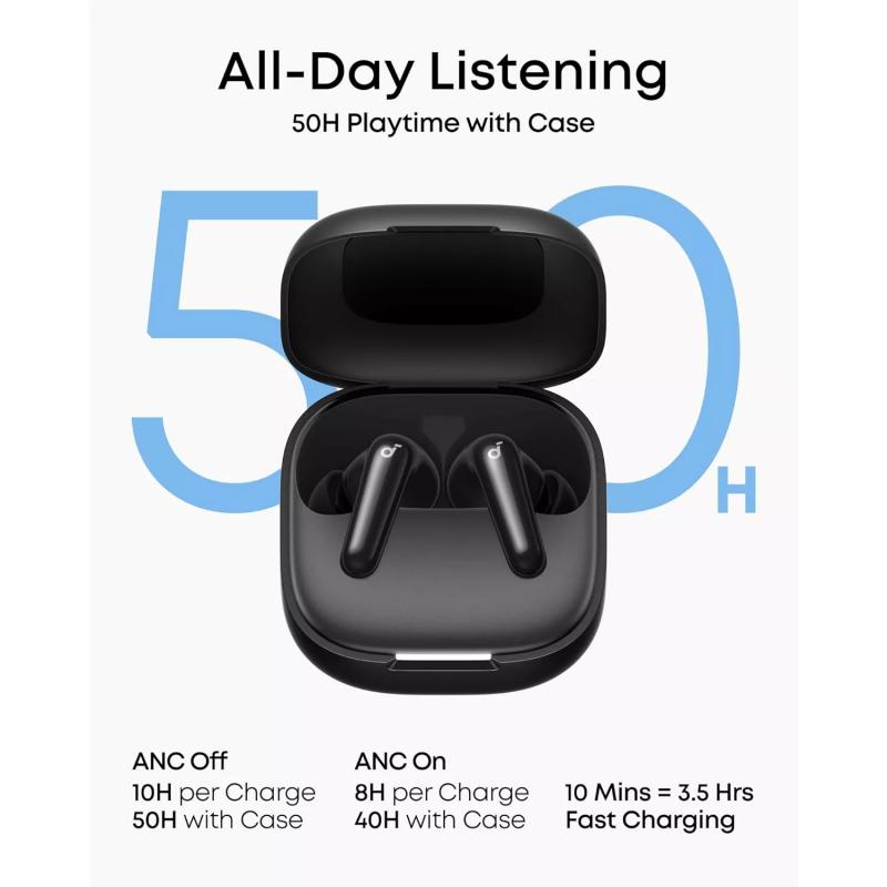 Med op til 10 timers afspilning på en enkelt opladning og op til 50 timer i alt med opladningsæsken er Soundcore R60i NC bygget til langvarig daglig brug. Understøttelse af hurtigopladning tilføjer ekstra bekvemmelighed og giver dig op til 3 timers lytning efter blot 10 minutters opladning. IP55-vand- og støvmodstand på øretelefonerne gør dem også til et pålideligt valg til træning, udendørs brug og daglig brug.
