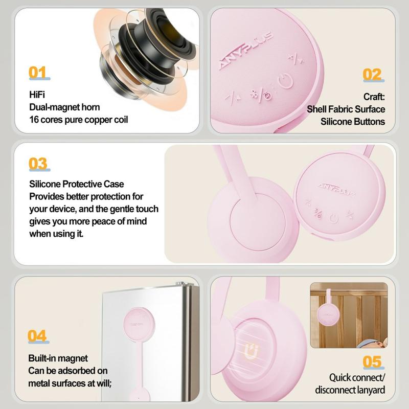 Denne alsidige enhed kombinerer en hvid støjmaskine med en Bluetooth-højttaler, der er designet til at hjælpe babyer, børn og voksne med at sove. Med 24 beroligende lyde, brugerdefinerede timerindstillinger og en optagefunktion skaber den et beroligende miljø, der bidrager til en afslappende søvn. Dens kompakte design og genopladelige batteri gør den ideel til både hjemmebrug og rejser.