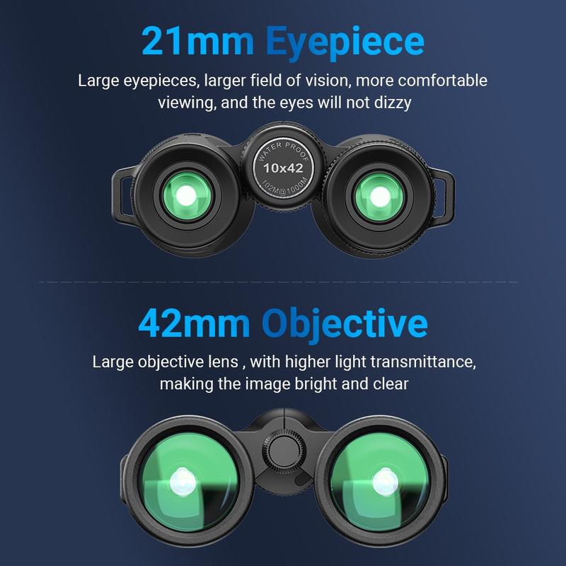 Et stort 21 mm okular og 14 mm øjenafstand giver behagelig visning, mens udgangspupillen på 4,2 mm sikrer stabil ydeevne under svage lysforhold som daggry, skumring eller skyggefulde skove. APEXEL 10×42-kikkerten er kompakt, men kraftfuld, og den er bygget til brugere, der kræver klarhed og pålidelighed udendørs.