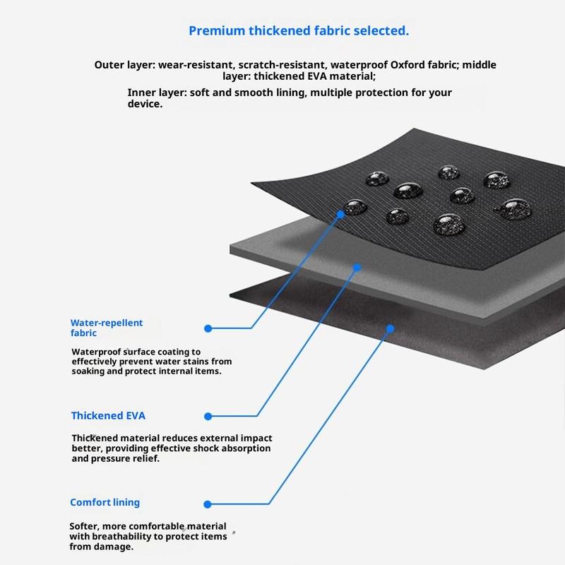 - Holdbar flerlagskonstruktion - Fremstillet af vandtæt Oxford-stof, EVA og polyester, der giver overlegen beskyttelse mod fald, støv og fugt.